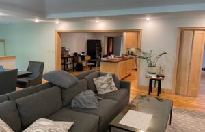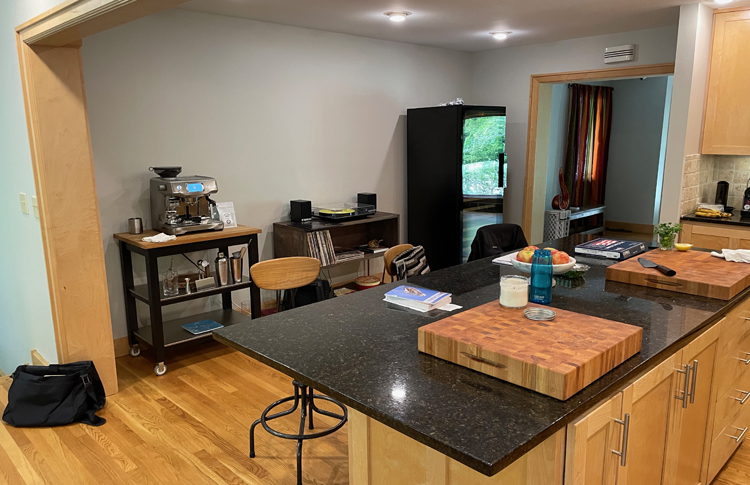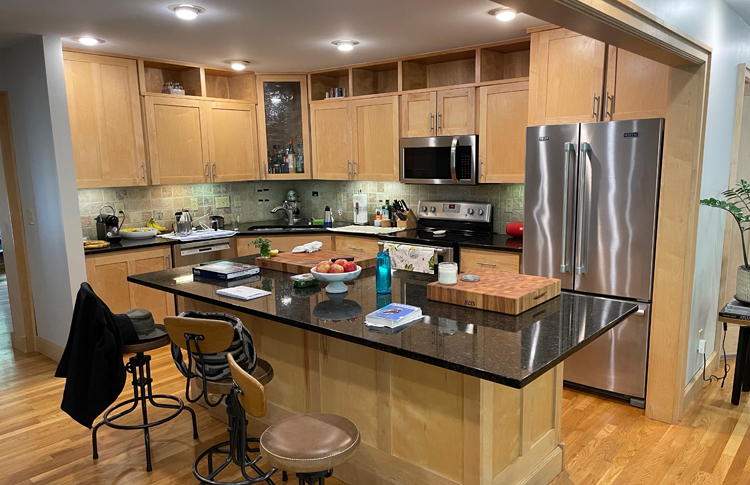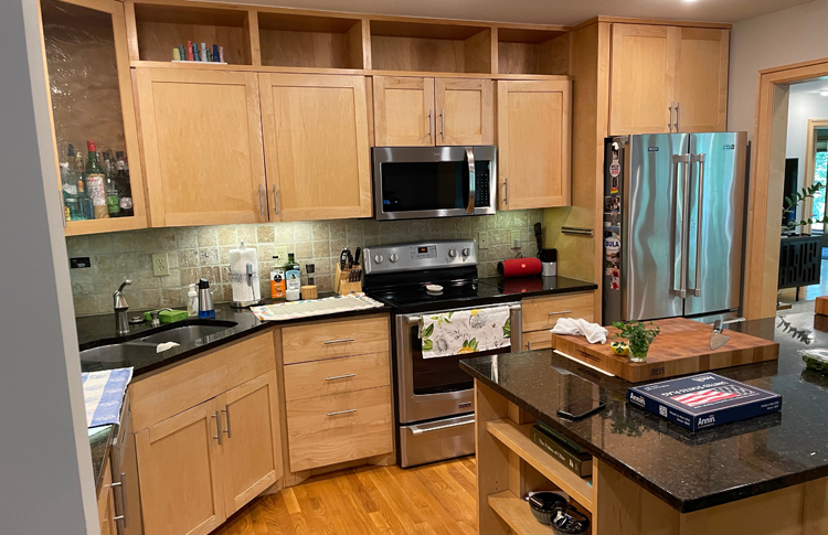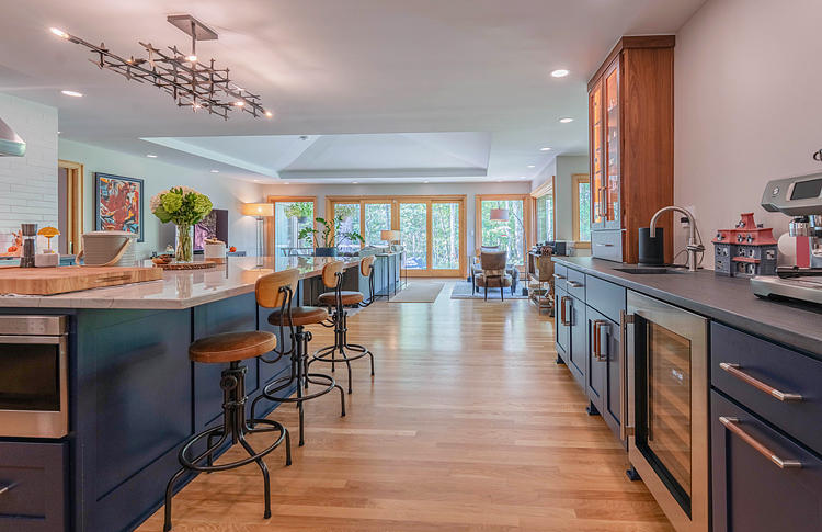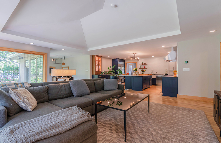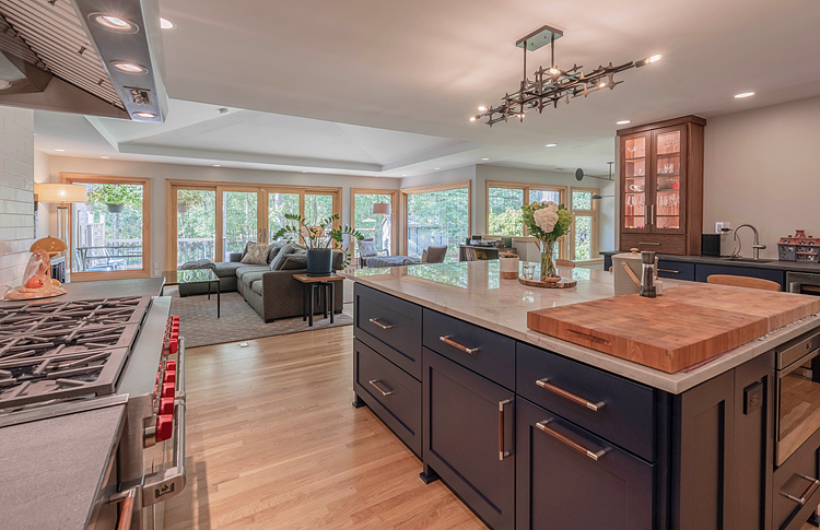 We removed the cased opening between the kitchen and living room, installing a new flush beam to carry the old back wall and roof load of the original house so that the ceiling in the kitchen would flow seamlessly into the living space.