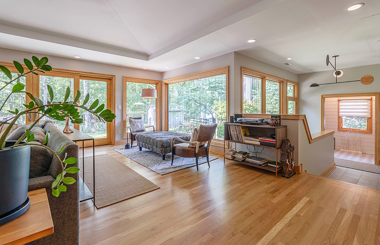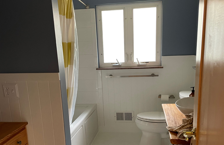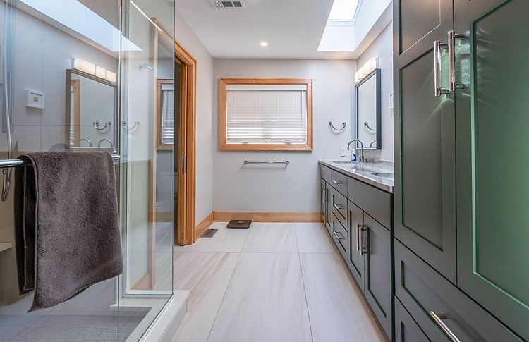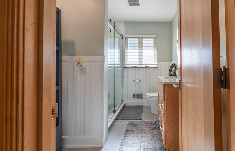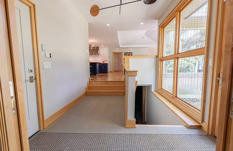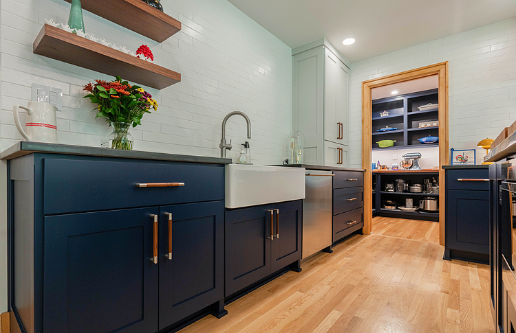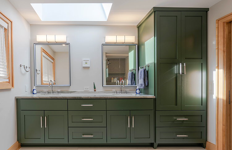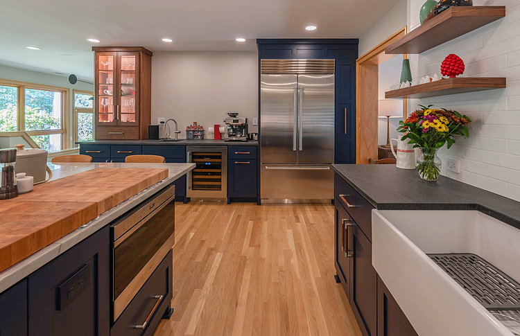 Trim and cabinets were designed to coordinate with the original woodwork in the house to maintain the mid-century feel.