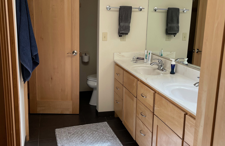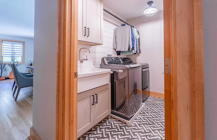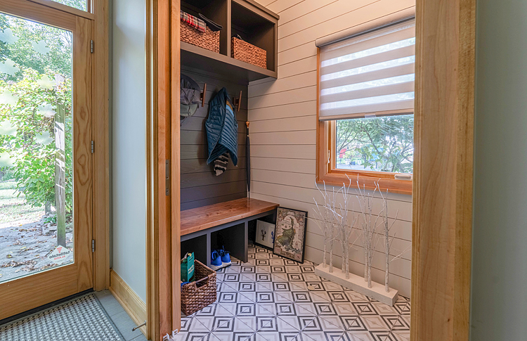 The kitchen was reorganized for a larger island, better work and counter space as well as direct access to a new walk-in pantry. The old remote storage closet by the garage was repurposed into a new mudroom.
