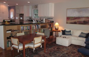 New built-in cabinets in the dining room combine linen storage below and a serving surface above. The height of the cabinets was designed to maintain views from the table to the backyard.